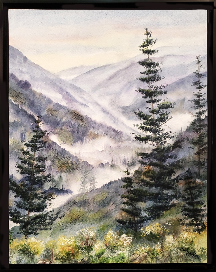 This is a recent Unglassed original watercolor. I love my Smoky hills and mountains and must pause for any view that includes them.