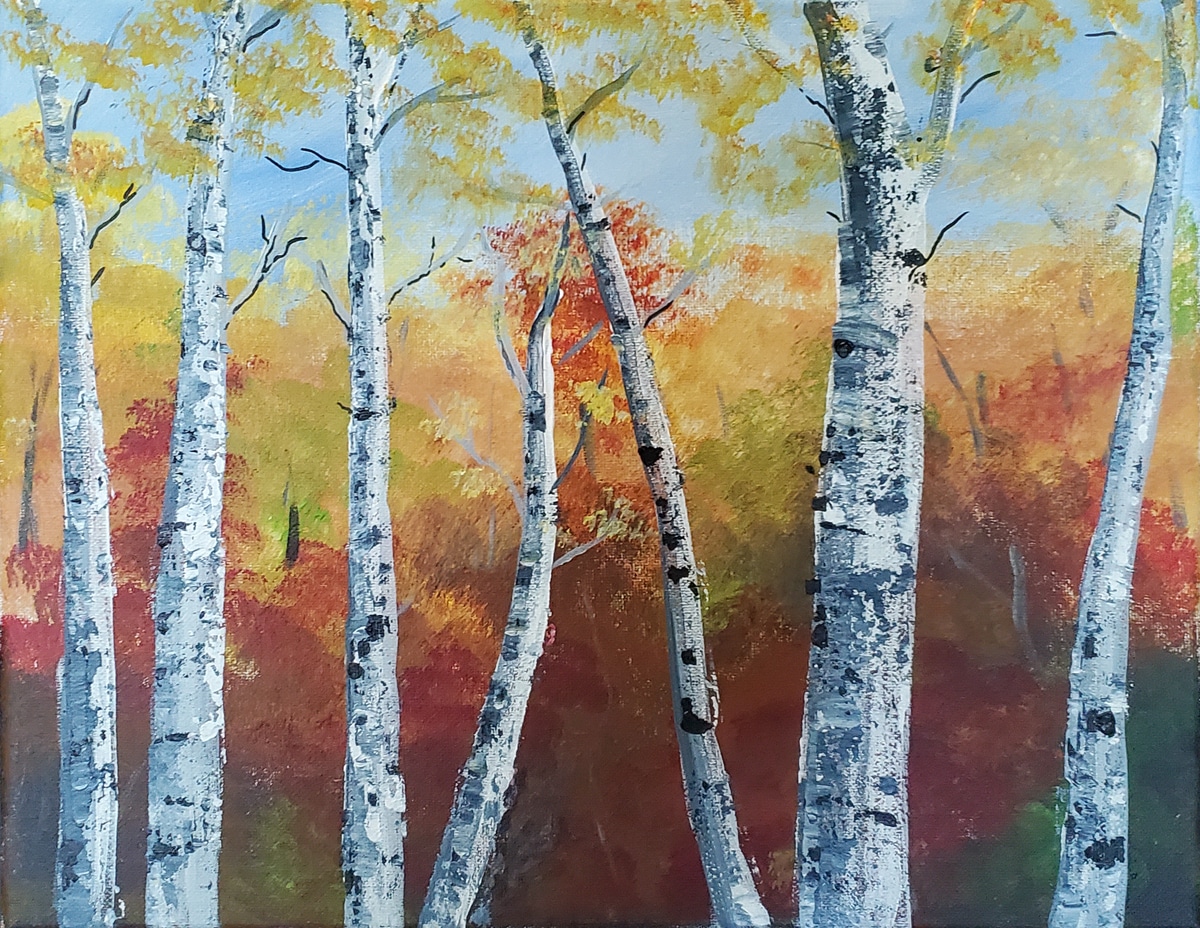 I will teach you techniques such as letting the paint brush do the work and create the detail for you and mixing on canvas in order to allow shadows and highlights to appear on their own. Birch trees are fun and fairly easy to paint and I can help with the drawing the pumpkins if needed. Once you learn these techniques, you can go home and use them to create art on your own. These paintings work for Beginner to advanced students.